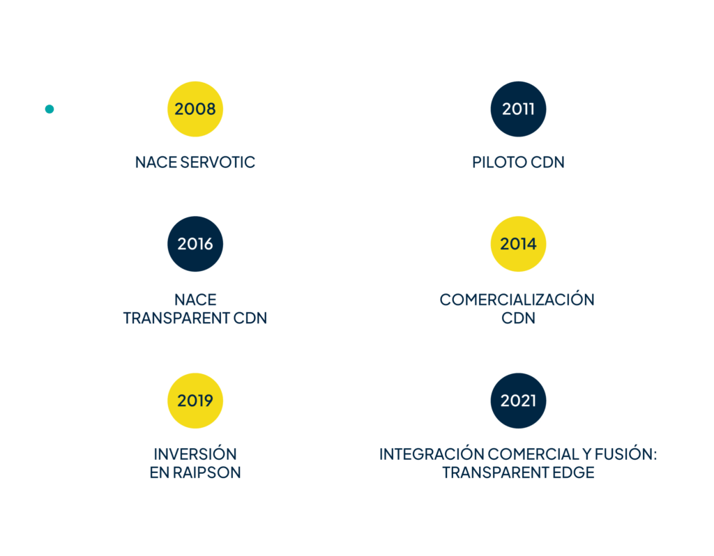 Fundada en 2021 tras la fusión de tres empresas tecnológicas españolas con más de una década de trayectoria, Transparent Edge unifica la experiencia en entrega de contenido, seguridad y arquitectura de sistemas para ofrecer una propuesta única en el mercado del edge computing.